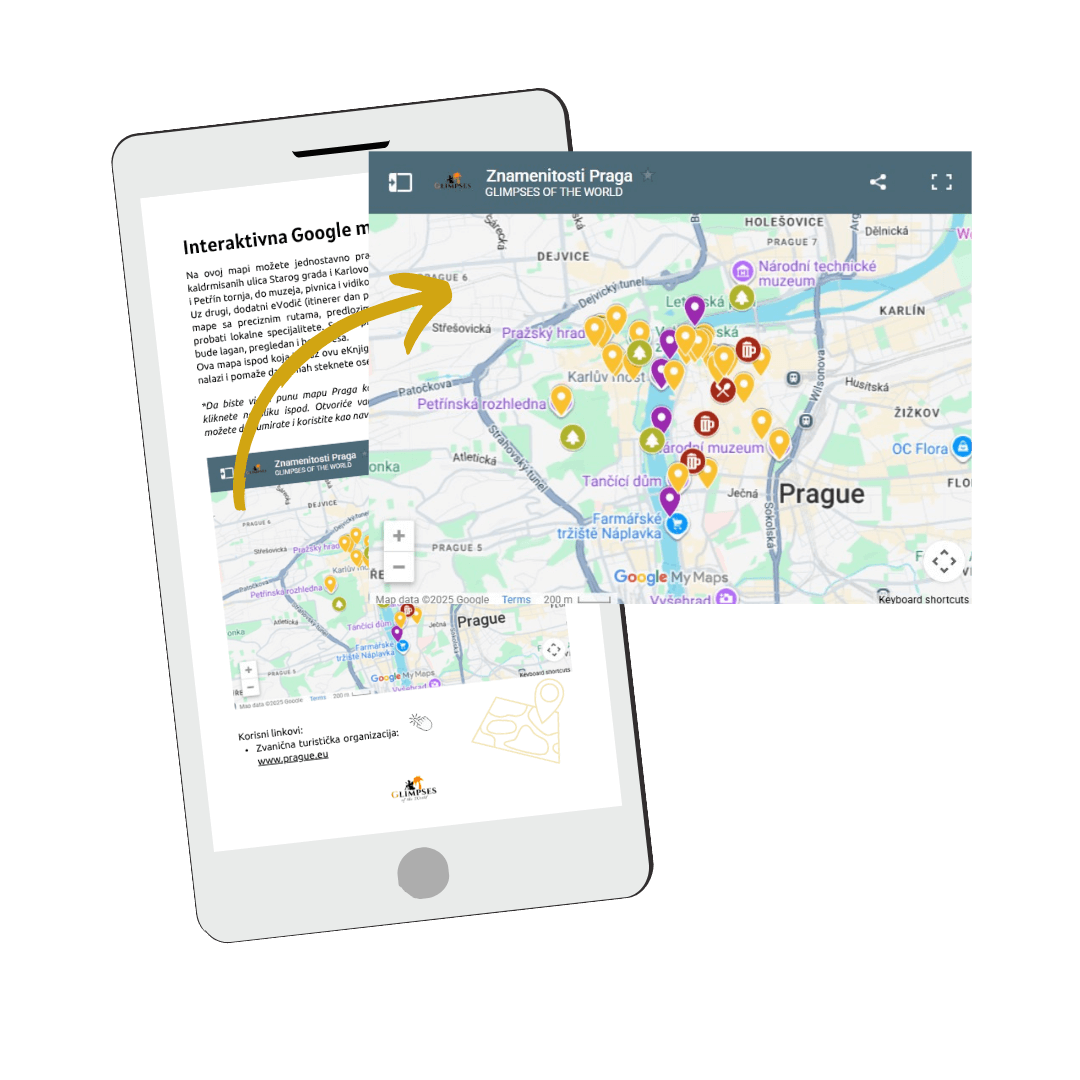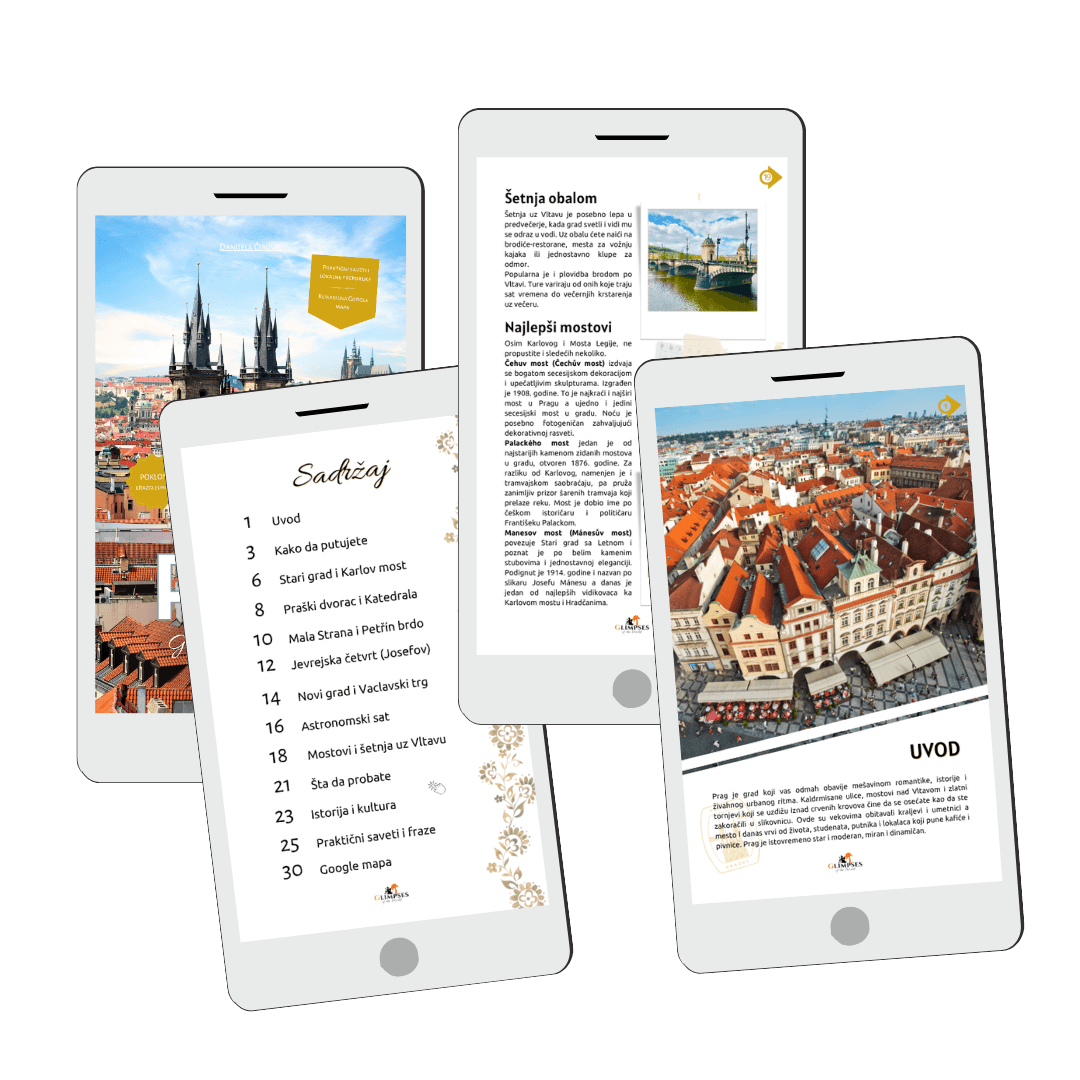 - „PRAG Detaljan vodič za 3 i 4 dana“ – unapred osmišljene rute sa klikabilnim Google mapama za svaki dan. Precizno pokazuje gde da krenete, kada da obiđete pojedine znamenitosti i gde da zastanete na kafu ili pivo. Savršen je za one koji žele da sve imaju isplanirano već pre putovanja.