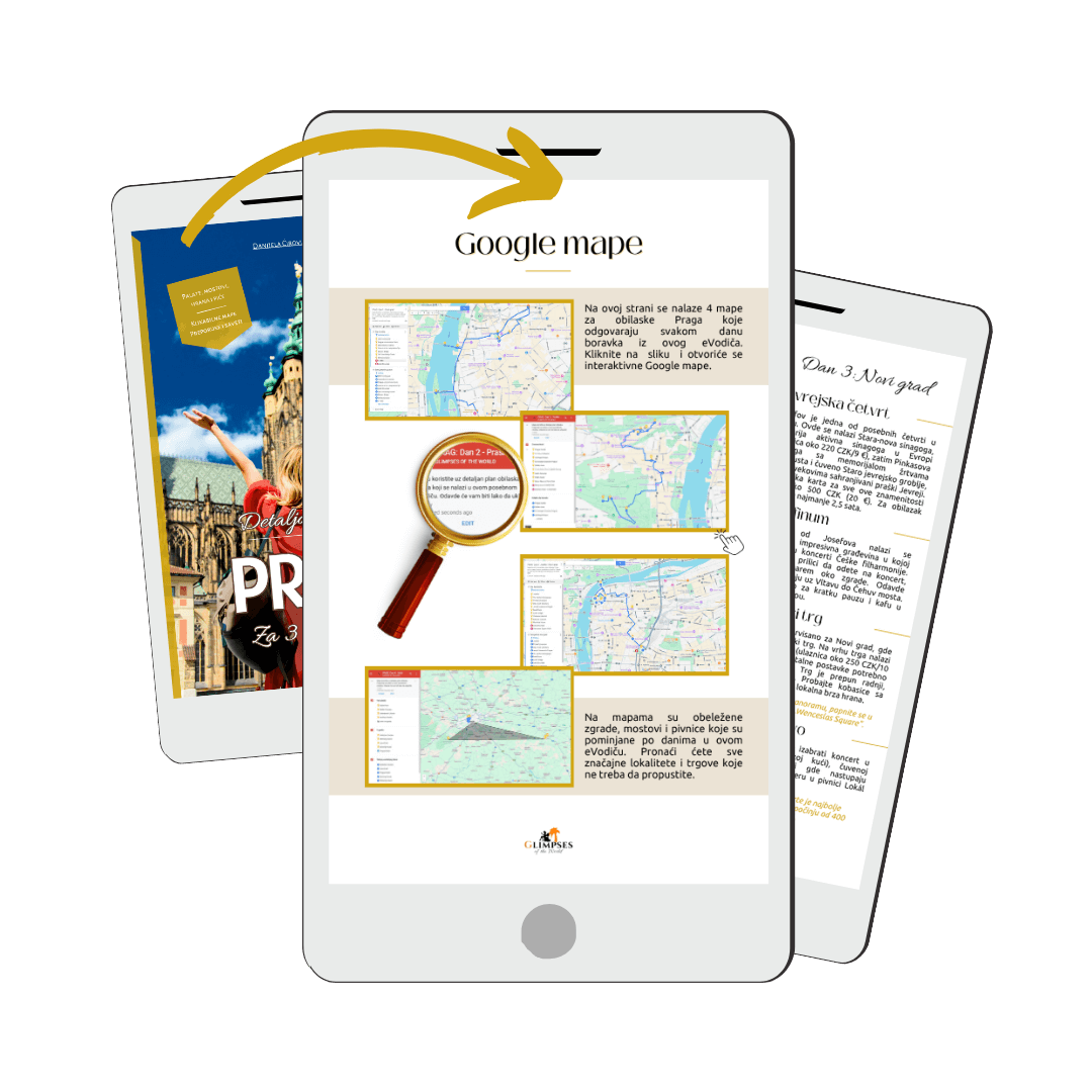 Ovaj vodič je osmišljen tako da bude jednostavan, pregledan i koristan dok ste na putu. Otvara se direktno na telefonu ili tabletu a svaka stranica sadrži precizne mape i rute koje možete pratiti u hodu. Uz to dobijate i lokalne preporuke – gde probati tradicionalni gulaš ili trdelník, gde se slikati bez gužve i kako da uštedite vreme pri obilasku znamenitosti.